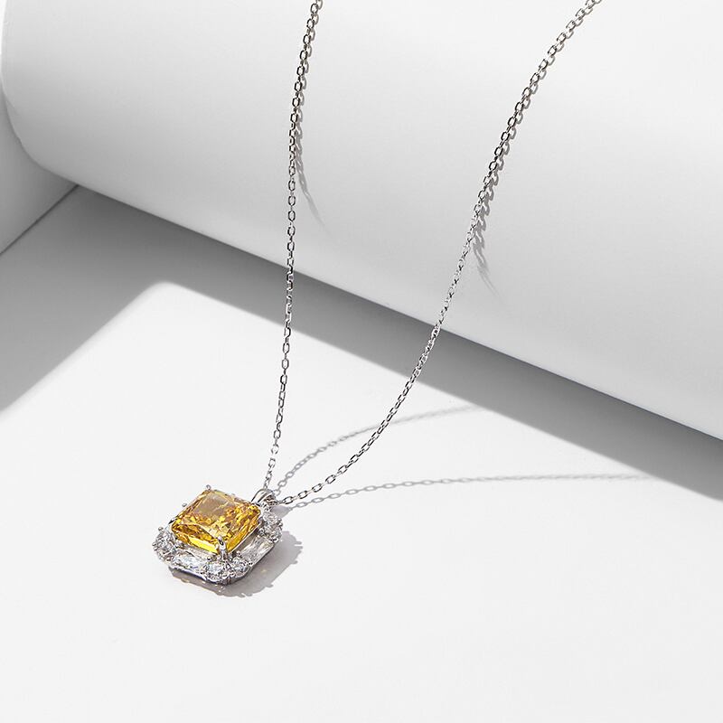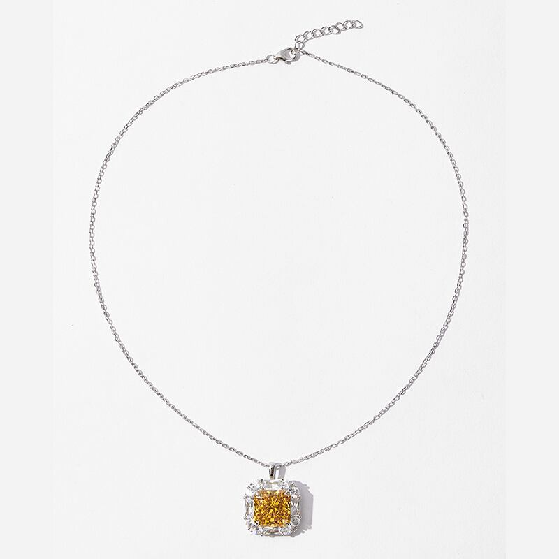 このペンダントは、S925純銀に18Kホワイトゴールドメッキを施し、洗練された輝きを放ちます。中央には、高炭素ダイヤモンドを使用し、氷の花カットによるユニークな輝きが魅力的です。イエローの色合いが目を引く10×10mmの厚めのスクエアデザインが特徴で、個性と高級感を演出します。
